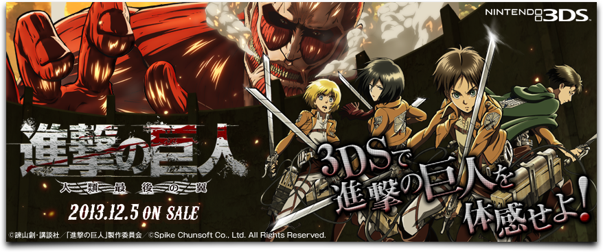 Attack on Titan: The Last Wings of Humanity is a 3DS game based on Attack on Titan Anime/Manga series. The game is developed by Spike Chunsoft and will be released on December 5th, 2013 in Japan.